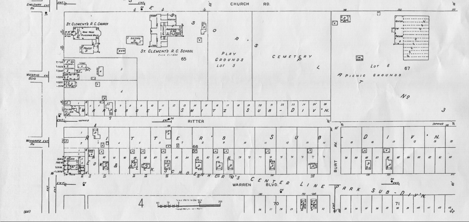 some of the street names shown on the map have changed over time: St. Clement Ave. became Stephens Rd., Herbert became Lorraine Ave., Church Road became Engleman Ave. (east of Van Dyke), Meyer became Arsenal Ave., Wilson became Busch Ave., Lincoln became Menge Ave. and Washington became Potomac Ave.