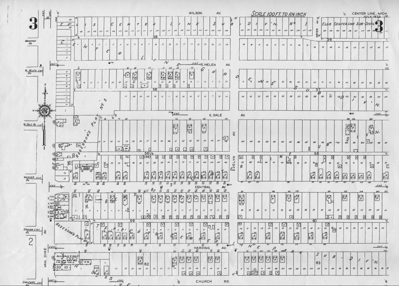 The maps at the bottom of this page cover about one-fourth of the village and they were created in July of 1932 for fire insurance rating purposes. Included are a small scale map of all the streets in the village, plus a larger scale map showing the lots and houses in the area bounded by Van Dyke Ave., Warren Blvd., Sylvan Ave. and Wilson (Busch) Ave. Similar maps from 1927 can be viewed here .