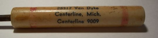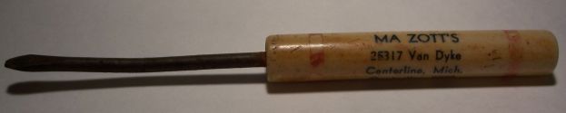 This 4.5 inch long, plastic-handled screwdriver is labeled with the name, address and phone number of Ma Zott's bar and grill, which dates it to the 1940's.