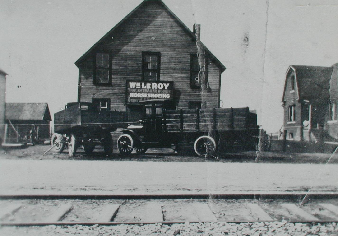 | The William LeRoy livery and blacksmith shop as it appeared circa 1911 (near right) and 1920 (far right). Note the electric street car tracks that ran along the east side of Van Dyke. The house at the far left in the near right photo was built in 1910 on the northwest corner of Qualmann Ave. and sometime in the late 1920's it was moved to its present location on Weingartz Avenue, immediately west of the Library. | |