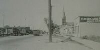 | The 1945 photo at far left shows the Robinson Lumber Co. building and its next door neighbor, the Liberty Theater (photo courtesy of the Water Winter Wonderland website). The Liberty Theater was built in 1927 and continued operation into the 1950's. It later housed Skelly's Roller Skating Rink. The photo at near left shows these buildings as they appeared in the mid to late 1960's. The C.F. Gibbs Lumber Co. had taken over Robinson's building and the Skating Rink was now the home of Grissom's Collision shop. The William LeRoy blacksmith shop once stood at about the same spot as the lumberyard, which was at 25135 Van Dyke. |